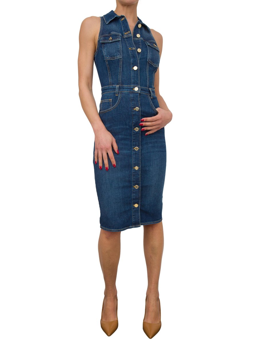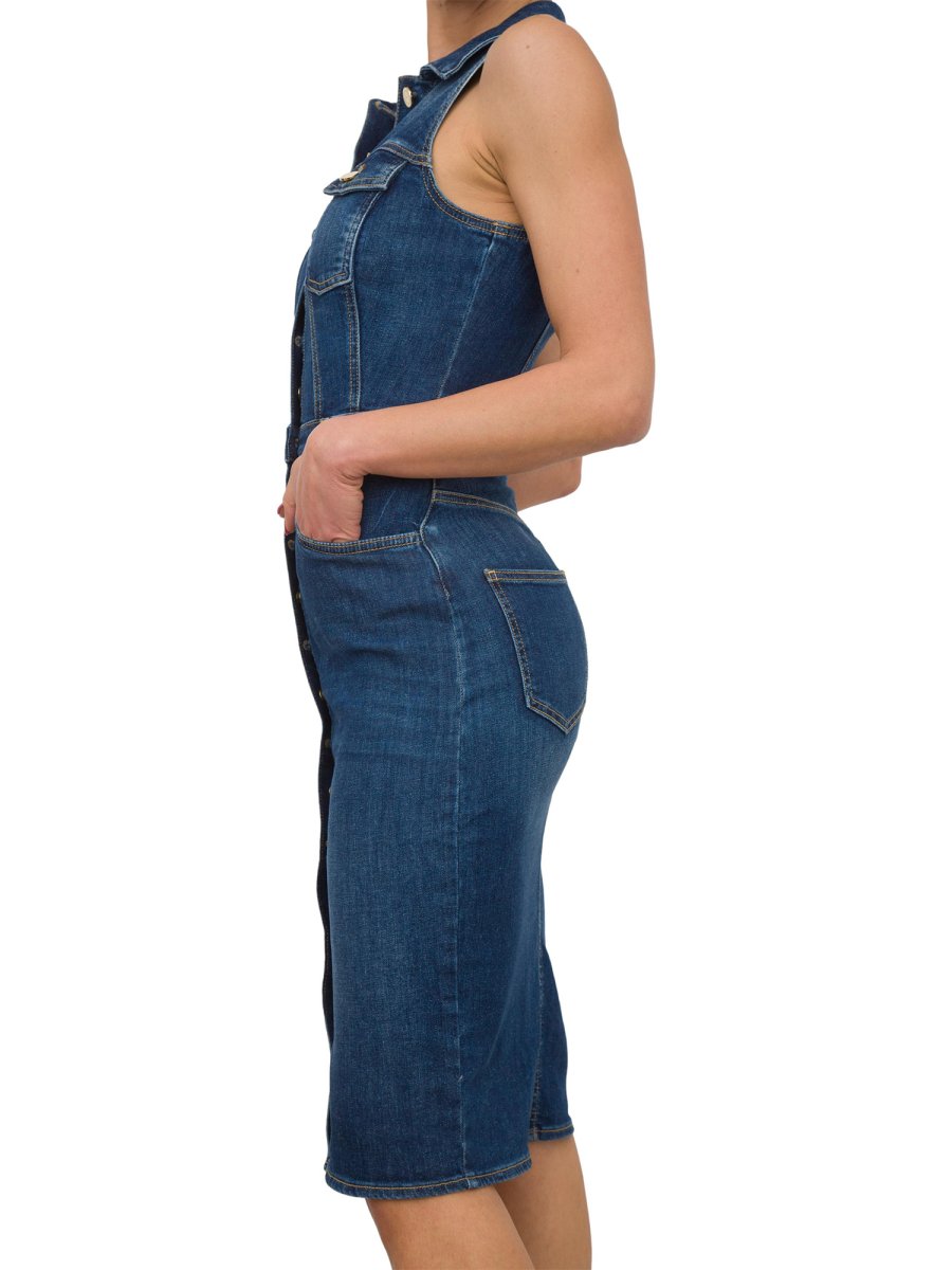 Abito midi in denim con scollo all'americana, abbottonatura nel davanti e tasche con patte.
