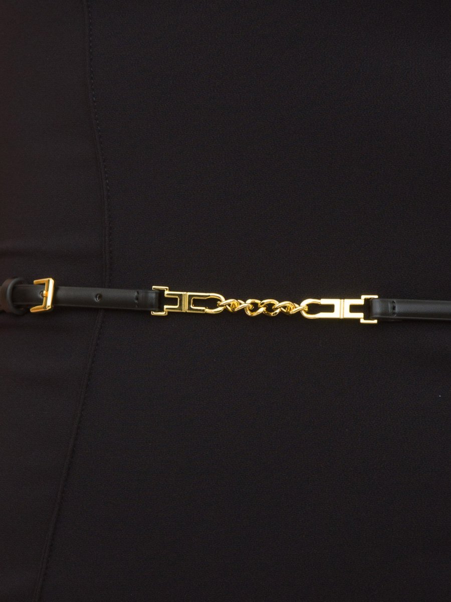 Abito midi in tessuto tecnico fluido stretch con motivo di cut out sul décolleté. Il punto vita è enfatizzato da una cintura con charm logo in metallo dorato.