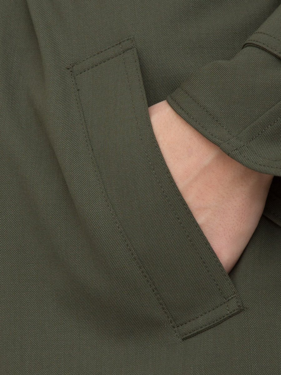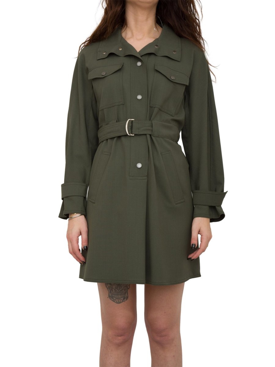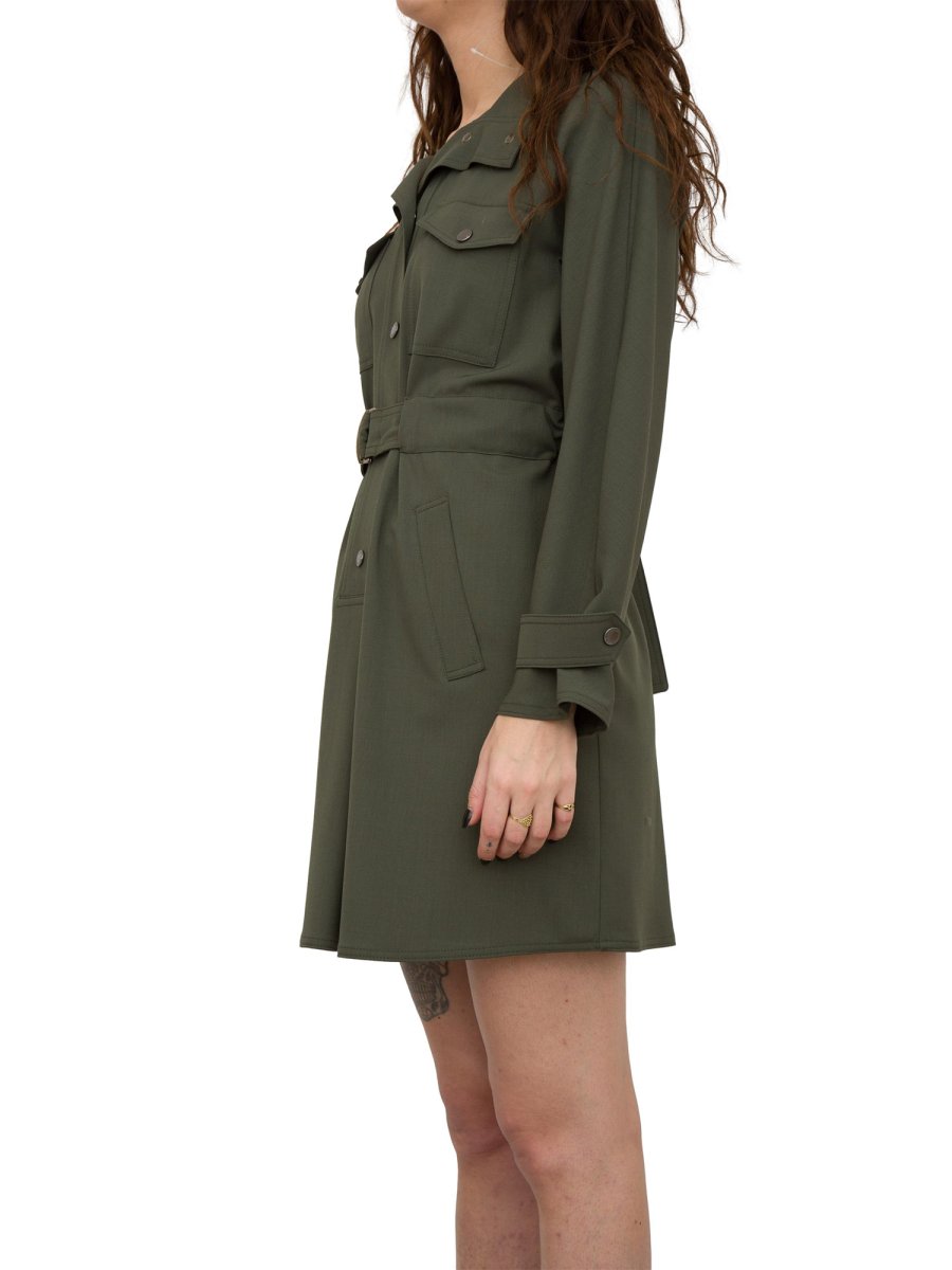 Короткое платье Max Mara, модель Brioso, выполнено из эластичного шерстяного габардина. Дизайн в стиле милитари с высоким воротом, застежкой спереди на металлические пуговицы и соответствующим съемным поясом. Длинные рукава с застежками-пуговицами на манжетах, карманы на бедрах и карманы с клапанами на кнопках на груди делают это платье стильным вне времени.