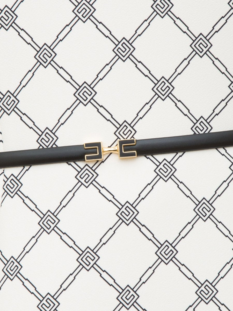 Платье без рукавов из эластичного крепа со слегка пышной юбкой. Платье выделяется сплошным ромбовидным принтом и контрастной окантовкой. Талия подчеркнута поясом с золотистым металлическим зажимом с логотипом. Облегающий крой.