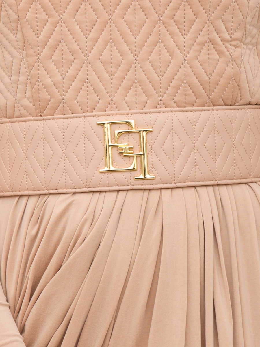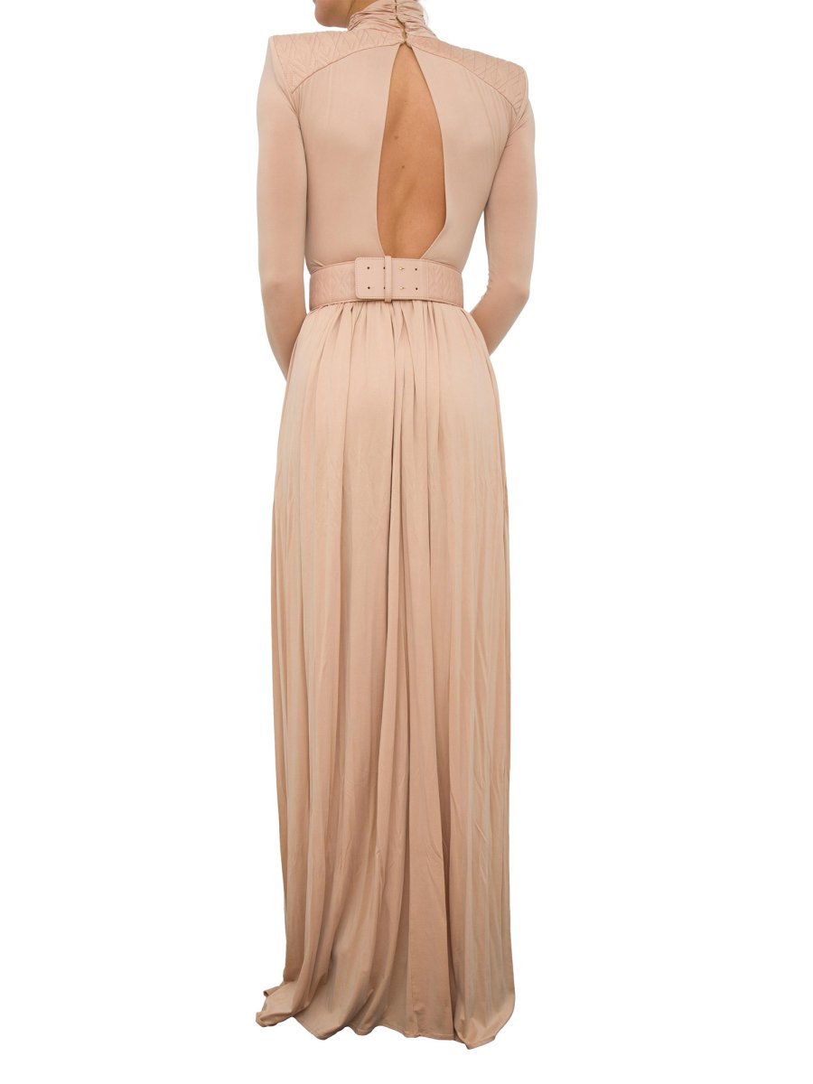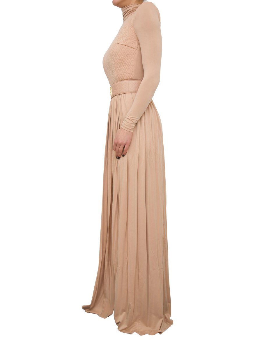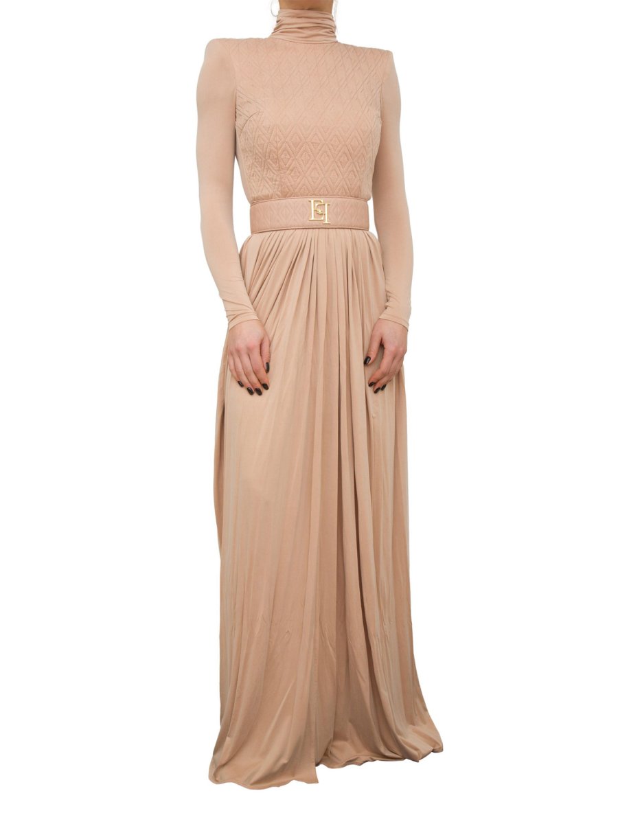Длинное платье Elisabetta Franchi для красной дорожки, выполненное из тонкой, удобной и элегантной эластичной ткани. Приталенный крой со стеганым бюстом, высокой горловиной и длинными рукавами. Пояс в тон на талии подчеркивает женственность, продолжая юбку с вырезом спереди и молнией сзади, которая элегантно повторяет движения тела. Идеально подходит для элегантного вечернего или официального образа.