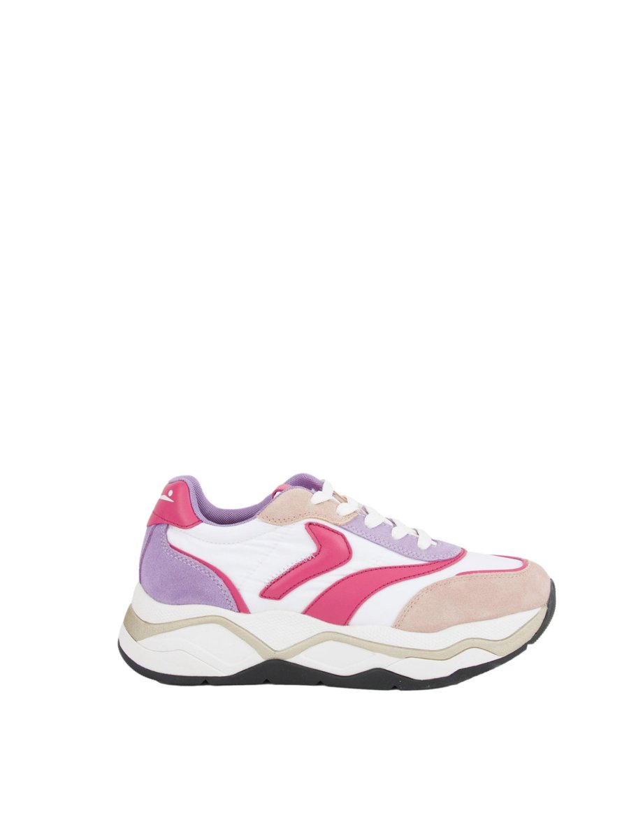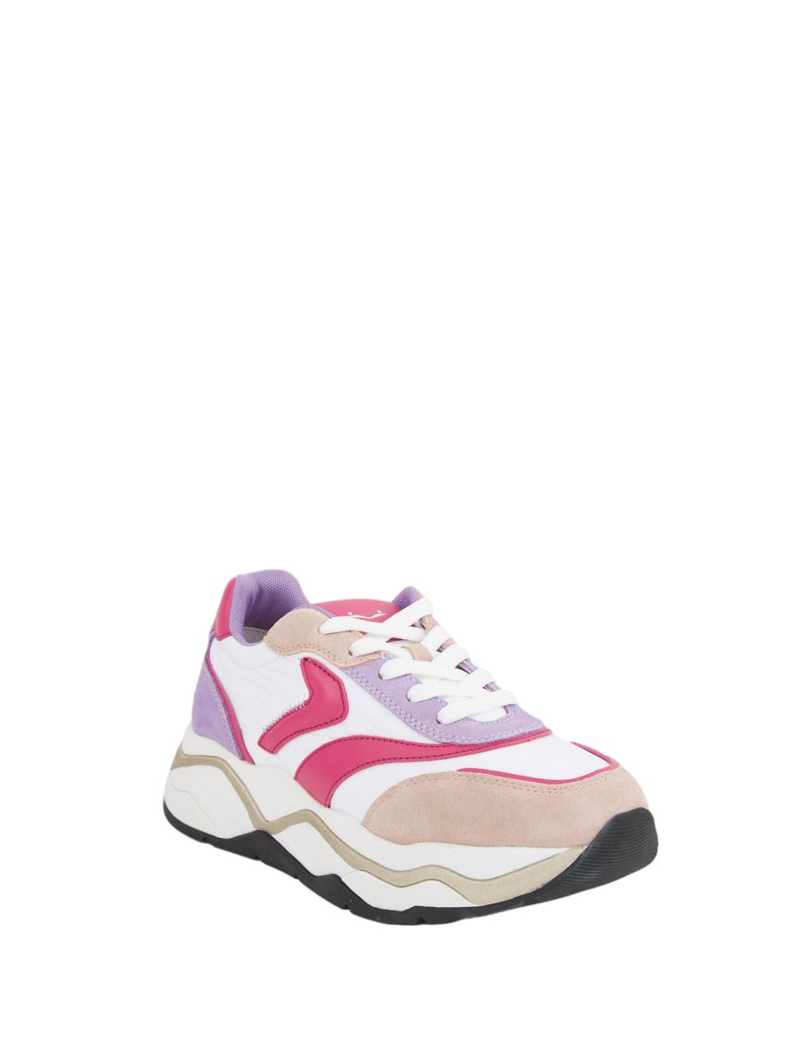 Sneaker in tessuto tecnico con inserti in suede, pelle e vitello laminato. Suola in EVA effetto plateau con bordo sagomato e inserto platino.