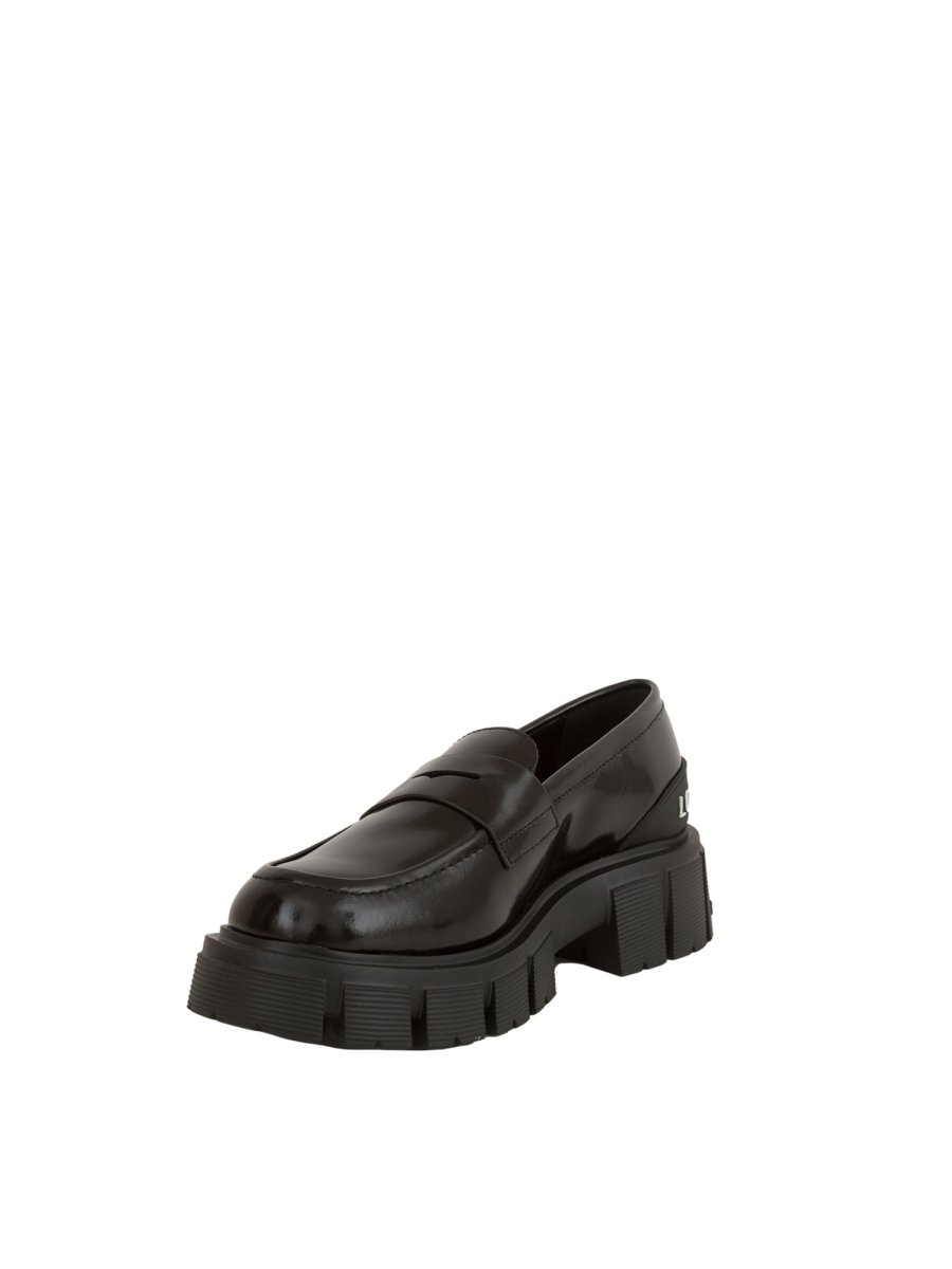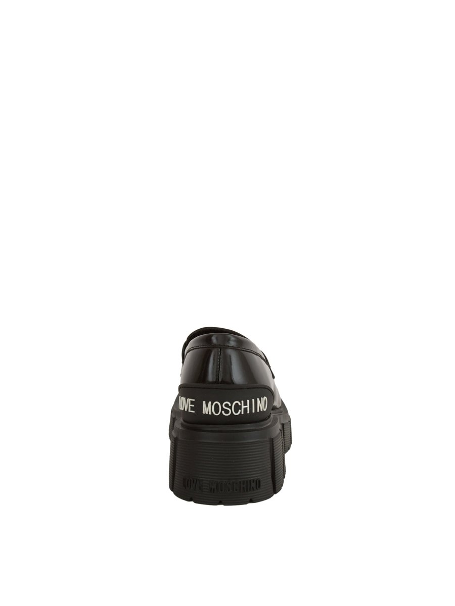 Mocassino donna Love Moschino con tomaia in vitello spazzolato, logo Lettering con cuore spezzato in metallo e fondo in gomma dal volume importante. Altezza del tacco : 4 cm