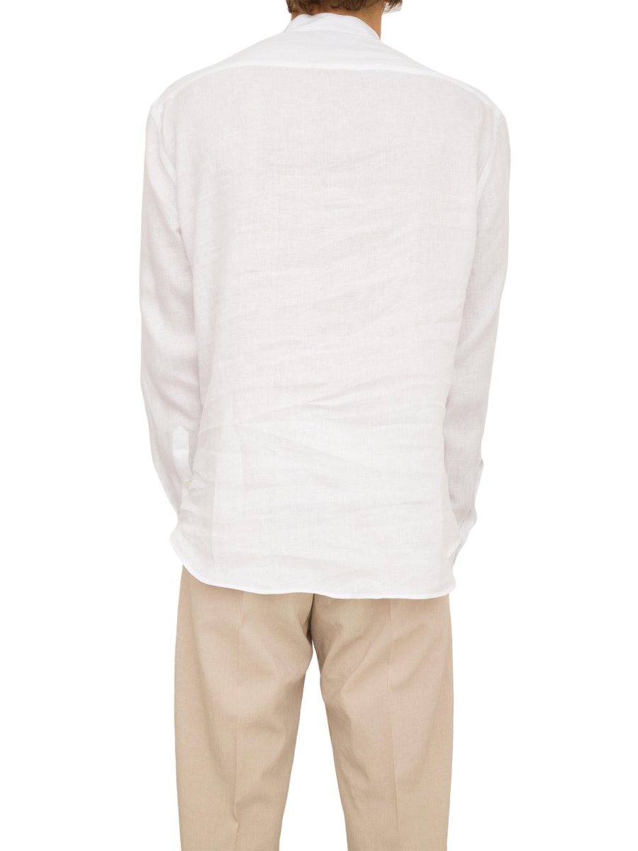 Camicia da uomo Emporio Armani in lino con collo alla coreana, maniche lunghe, vestibilità regular e chiusura con bottoni.