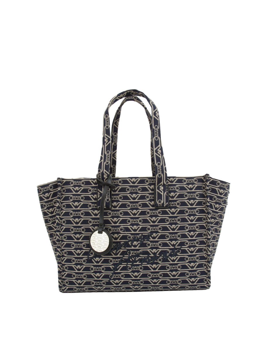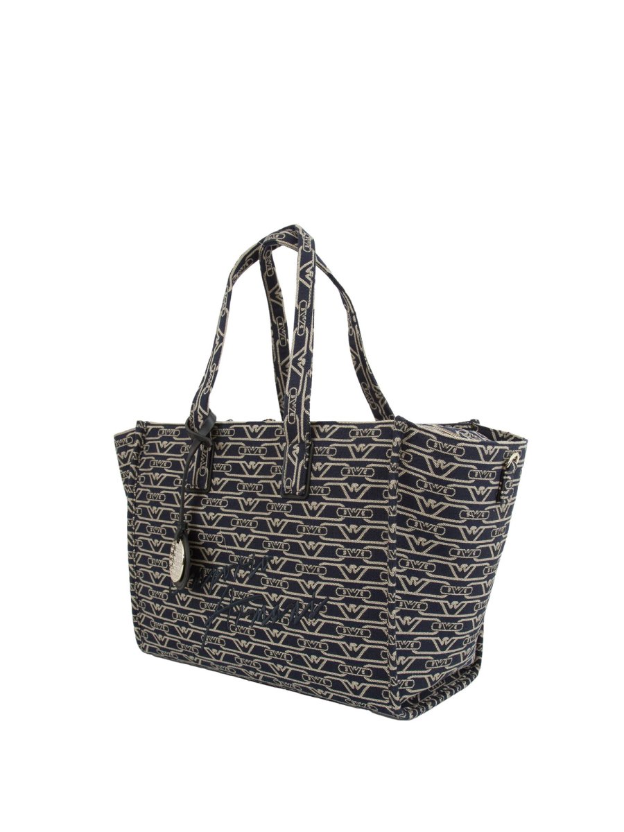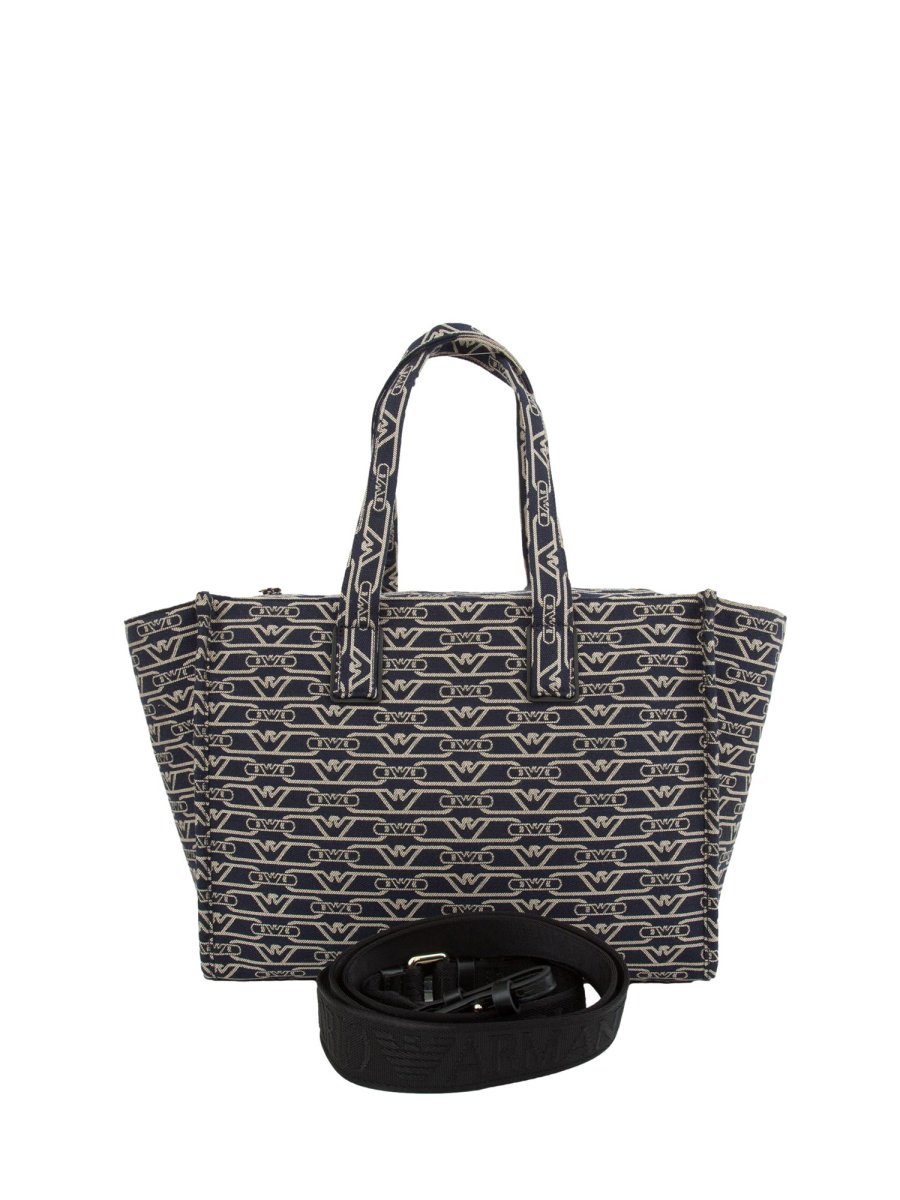 Сумка-шоппер Emporio Armani середнього розміру з подвійною ручкою, практичним плечовим ременем з фірмової стрічки і фірмовою підвіскою з полотна. Серія аксесуарів, що характеризуються щільним жакардовим візерунком з монограмами по всій поверхні та доступними у функціональних моделях, призначених для жінок Emporio Armani, які завжди у русі. Розміри: 51 x 17 x 27 см.