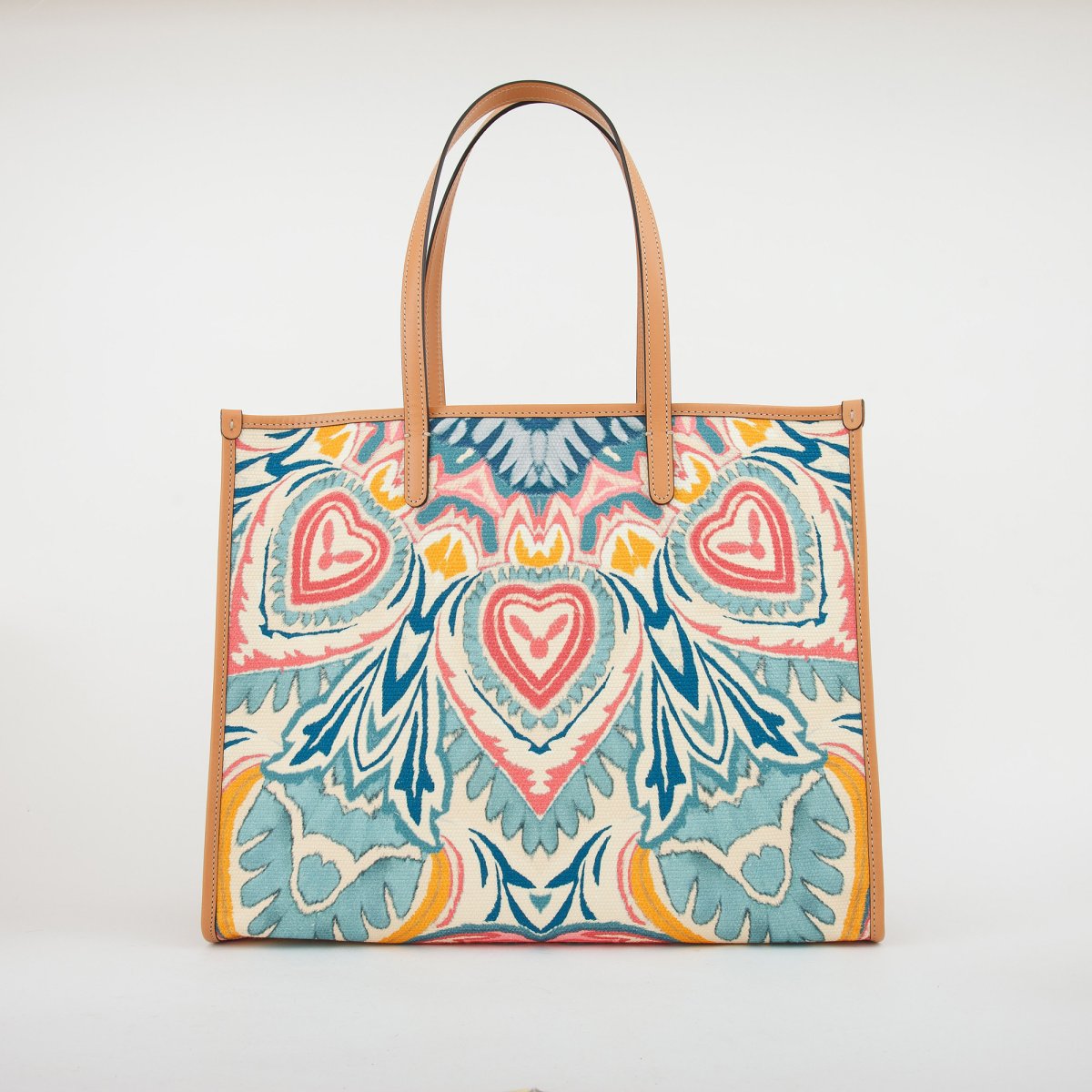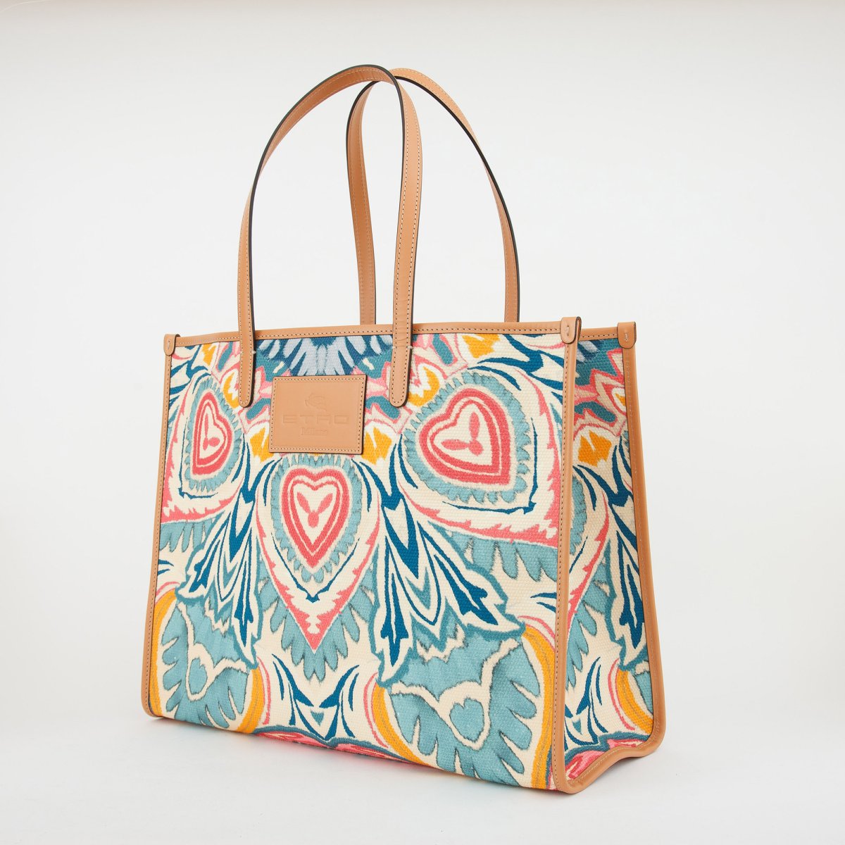 Shopping bag grande realizzata in tessuto di cotone con dettagli in pelle e impreziosita da una stampa piazzata Paisley a raggera multicolor ispirata a composizioni floreali. 42,5 x 35 x 17 cm