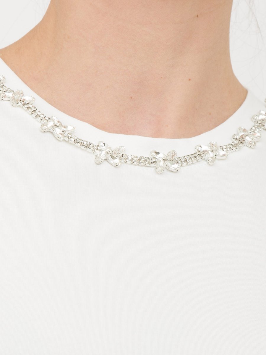 Футболка прямого крою з джерсі з оборками поплінами на проймах, круглим вирізом і аплікаціями з дорогоцінного каміння. Ідеально підходить для надання жіночності вашому повсякденному образу.