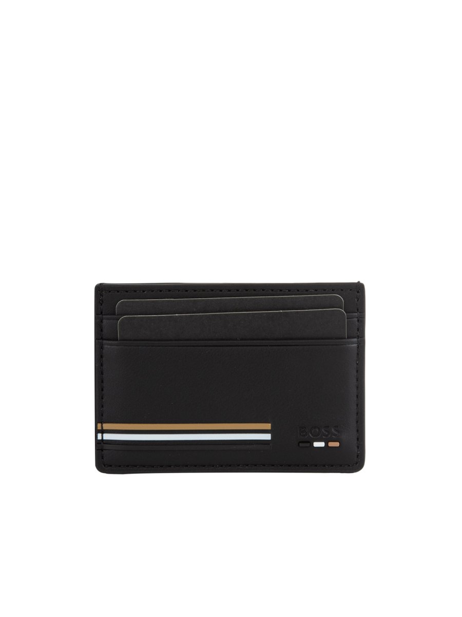 Portatessere BOSS realizzato in similpelle con logo goffrato e dettagli a righe nei colori tipici del marchio. Dimensioni: 7 x 10 cm.