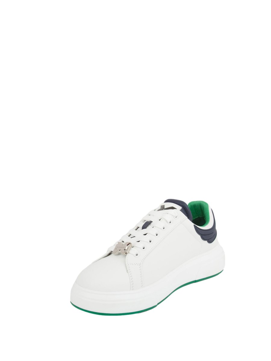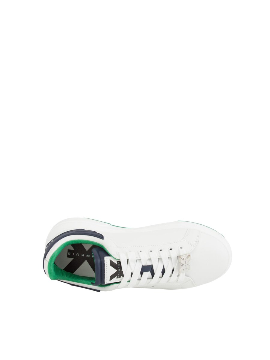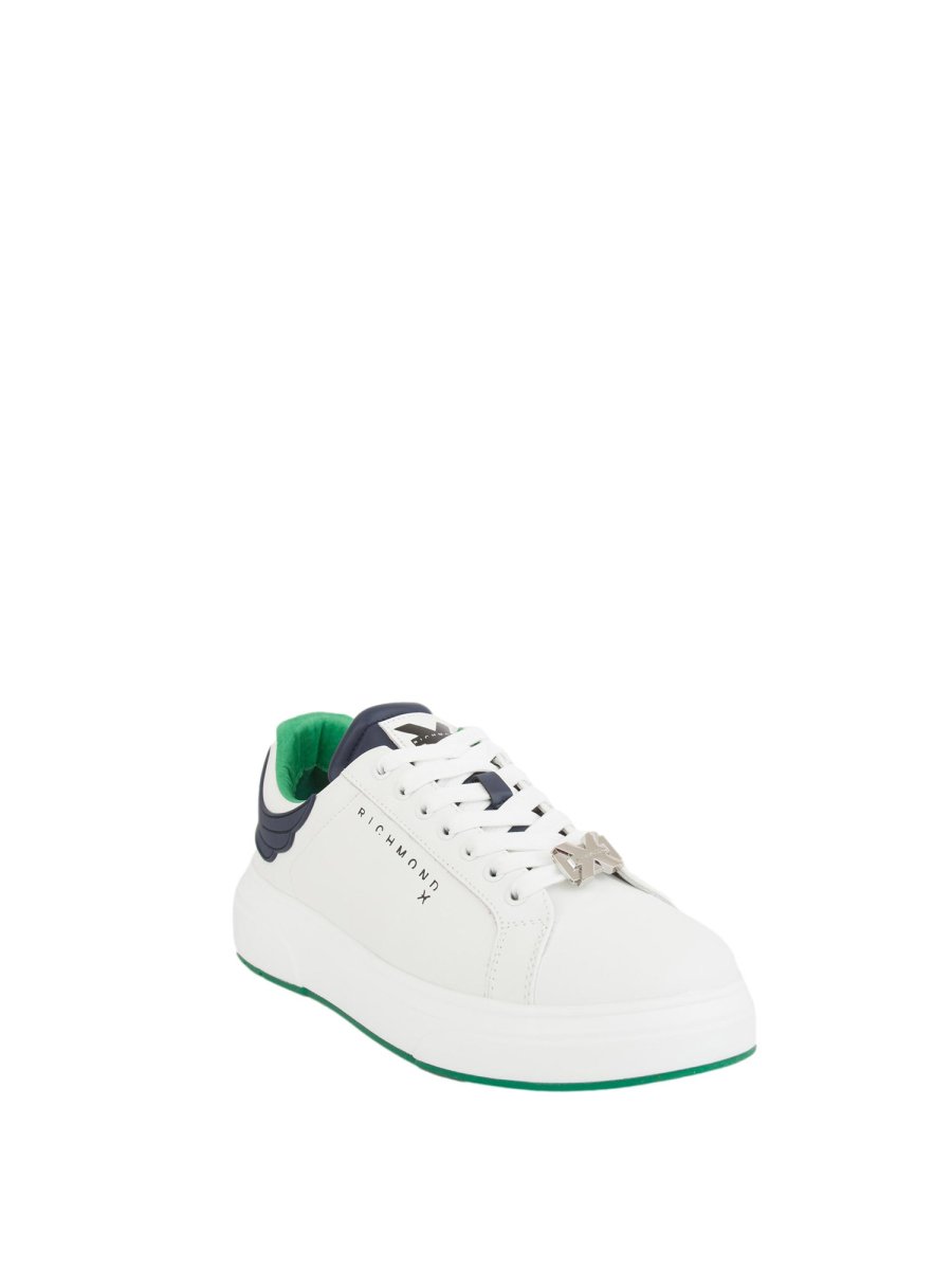 Чоловічі кросівки Richmond X з білої шкіри з контрастною вишивкою синій у вигляді крил і логотипом ззаду. Дизайн доповнює контрастний синій язичок з логотипом та устілка зеленого кольору, як і внутрішній бік взуття. Спортивний і модний одночасно, ідеально поєднується із повсякденною шикарною сукнею або джинсами.