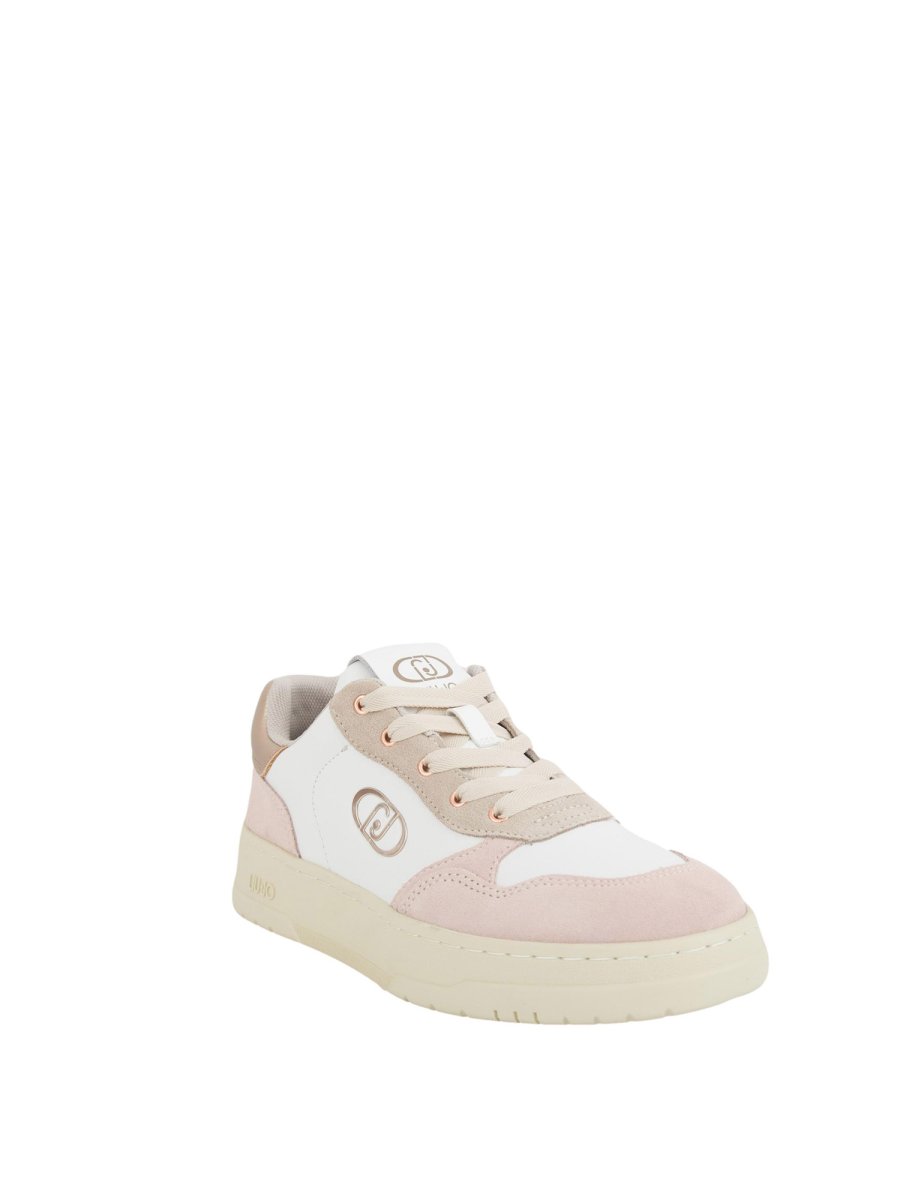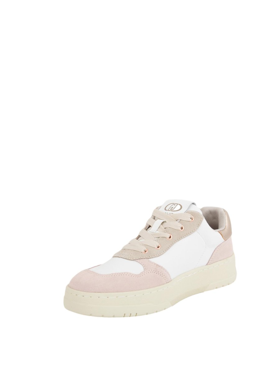 Кросівки Liu Jo з білої шкіри та бежево-рожевої замші з глянсовою деталлю на п'яті. Дизайн із металевим ефектом логотипу LJ, язичком з надрукованим логотипом та плоскими шнурками. Плоска гумова підошва висотою 4 см із тисненим логотипом.
