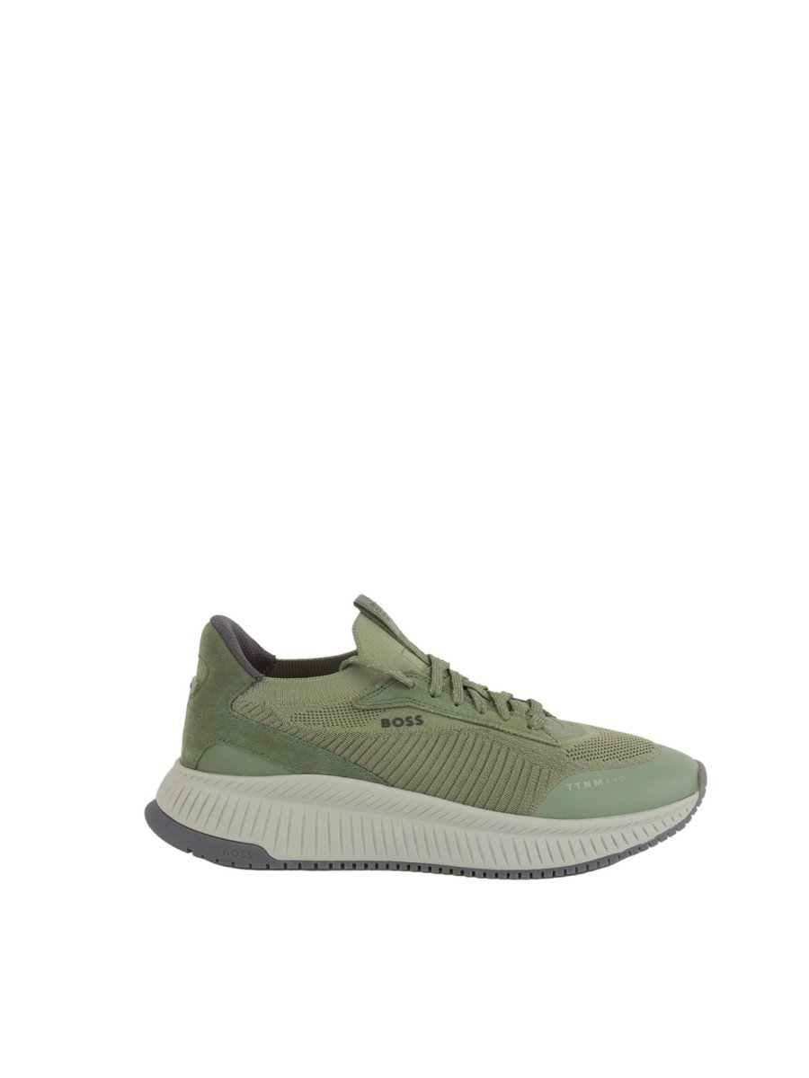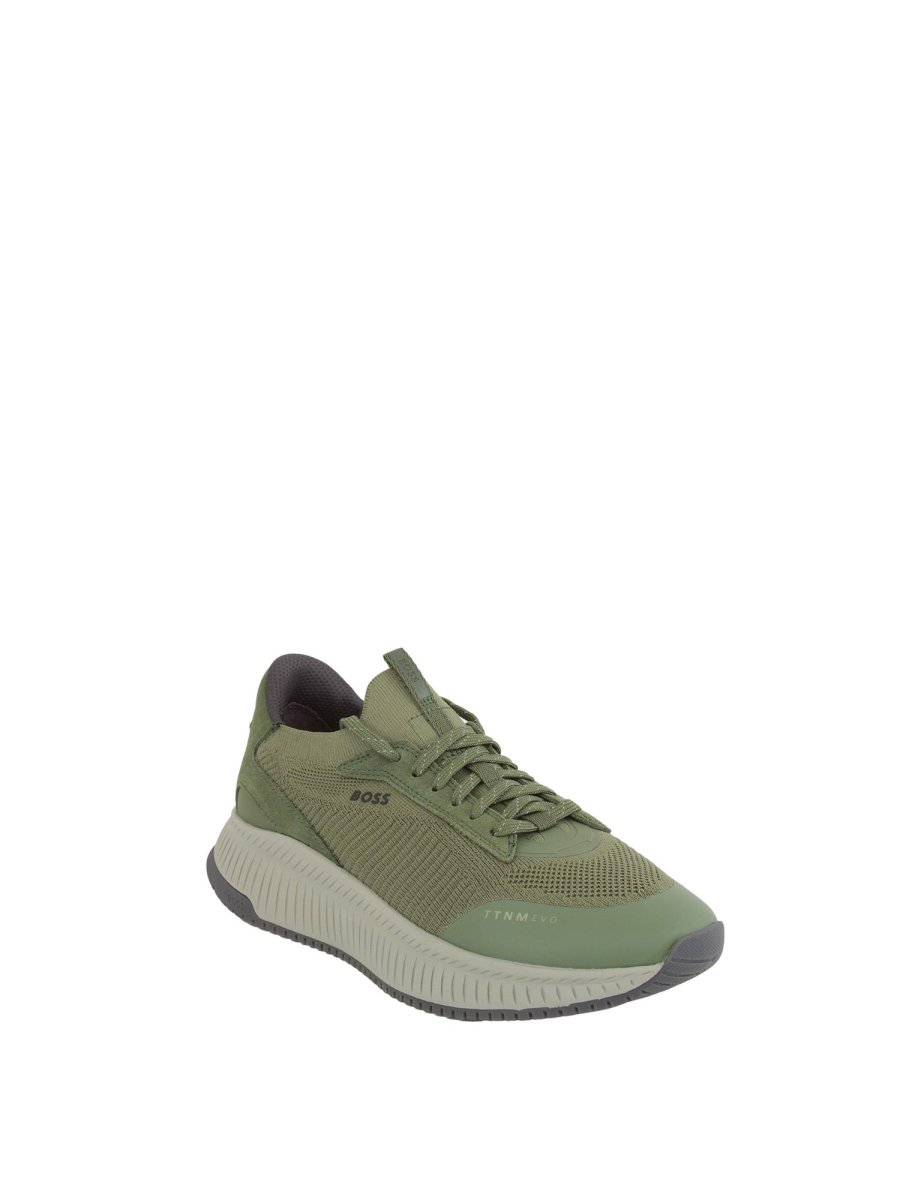 Sneakers BOSS con tomaia in maglia, logo a contrasto e suola a spina di pesce.