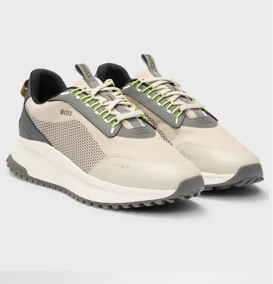 Полегшені кросівки Hugo Boss зі змішаних матеріалів мають сучасну ребристу підошву. Виготовлені з використанням технології GORE-TEX, взуття водонепроникне, дихаюче та вітронепроникне, що забезпечує сухість ніг та максимальний комфорт у будь-яких погодних умовах.