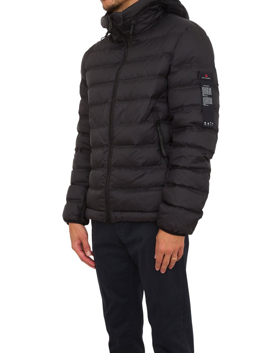 Piumino Peuterey in nylon superleggero 20 denari con superficie semilucida, dal peso di soli 40 grammi. Collo alto con nastro logato, chiusura con zip per le tasche e, a doppio cursore e pressofusa, per il capo. Tutti i dettagli sono in colore nero. Comoda tasca interna porta oggetti.