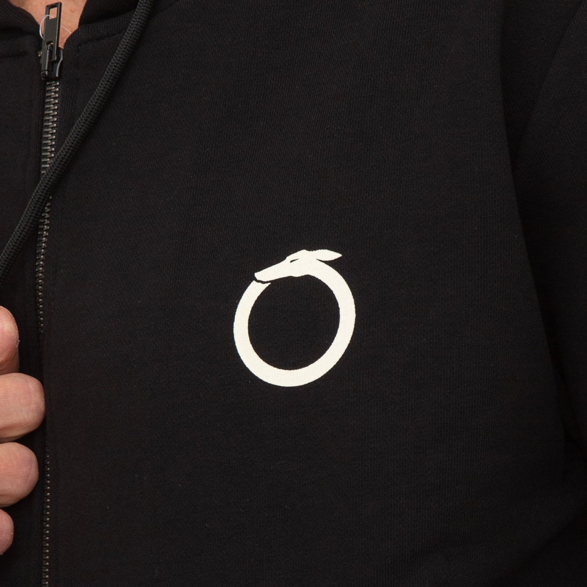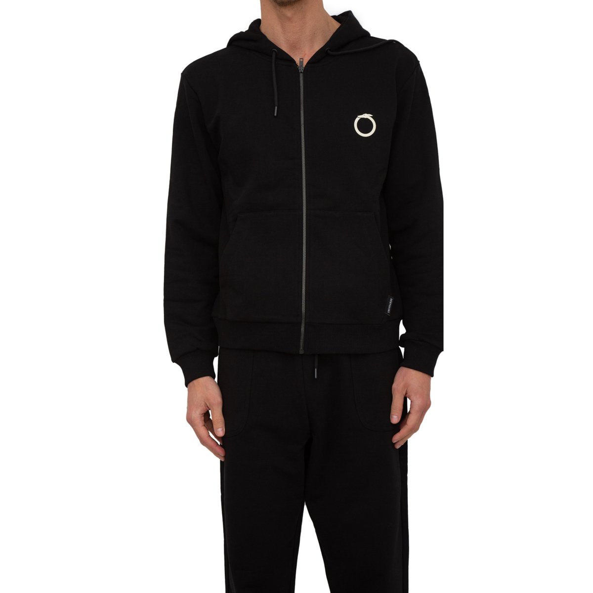 Felpa in cotone garzato con cappuccio, tasca a canguro e chiusura con zip, personalizzata con il logo Levriero circolare.