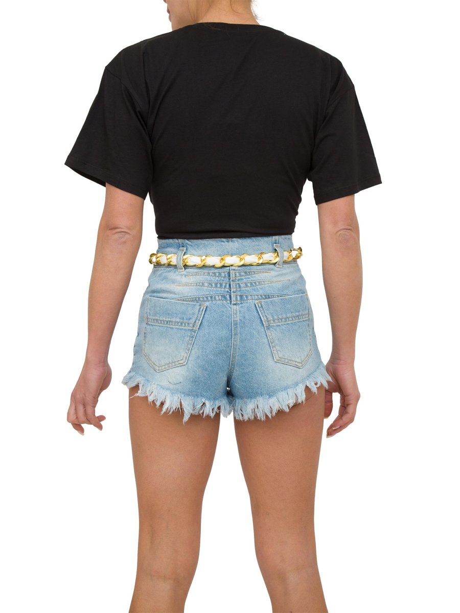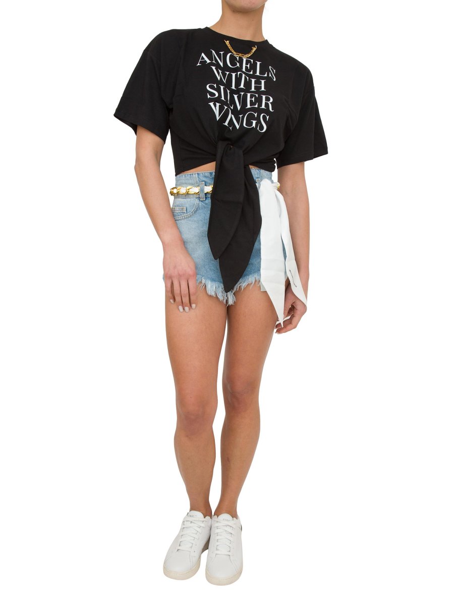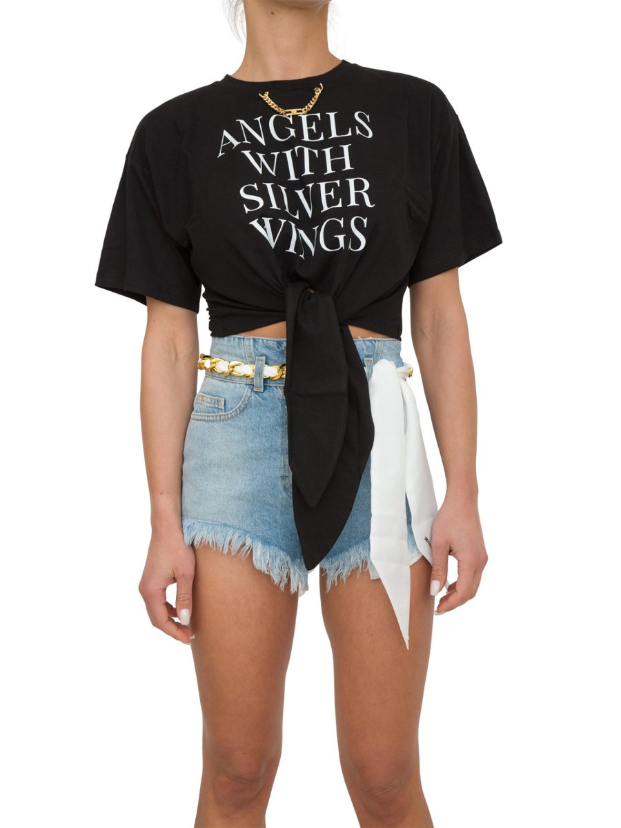 T-shirt in jersey di cotone con nodo in vita. È caratterizzata da scritta stampata ad acqua sul davanti e accessorio catena in metallo dorato.