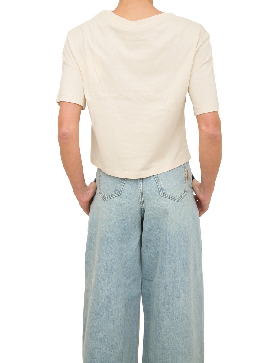 T-shirt cropped realizzata in tessuto organico con etichetta logata, collo tondo e maniche corte.