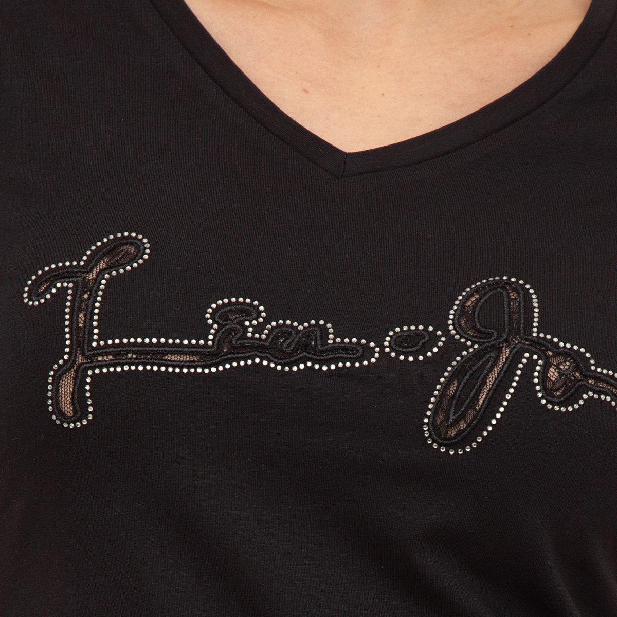 T-shirt nera in jersey di cotone stretch, dettaglio in pizzo, scollo a V, maniche corte, e logo con strass sul davanti.