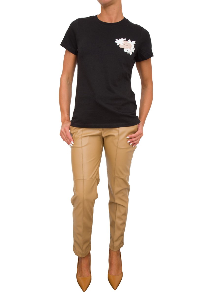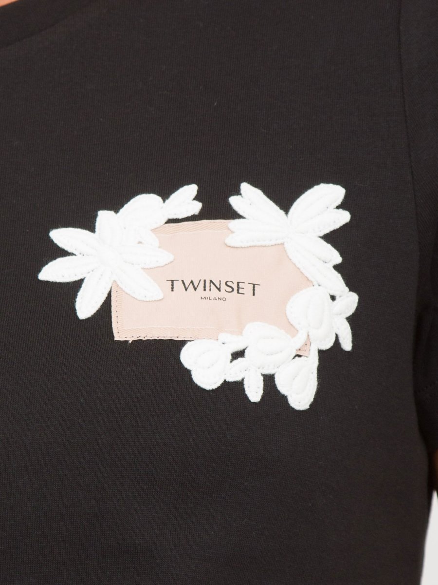 Футболка Twinset з короткими рукавами, круглим вирізом в рубчик і декоративною нашивкою на грудях. Прямий крій для максимальної свободи рухів, ідеальний для повсякденного та комфортного стилю.