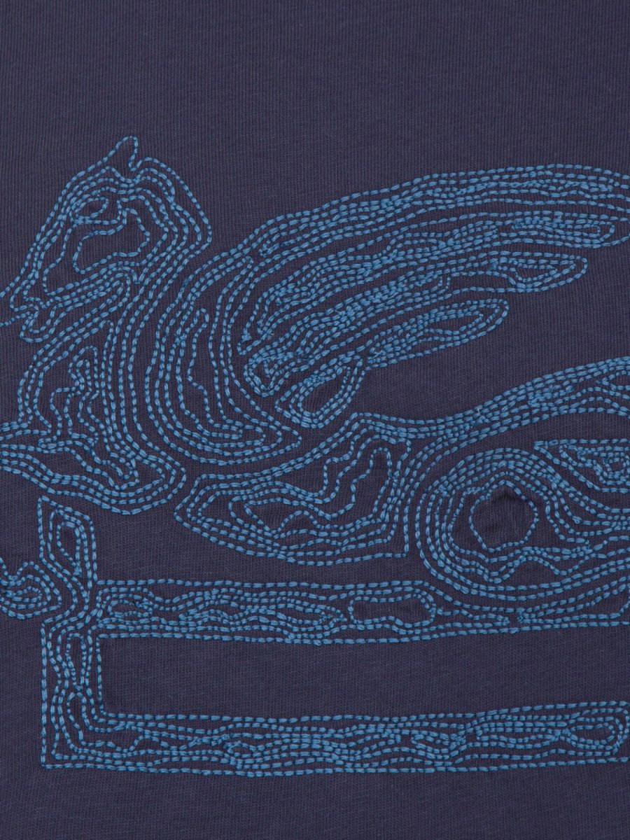Чоловічі футболки з круглим вирізом Etro із чистої бавовни, прикрашені великою вишивкою Пегаса в тому ж тоні спереду. Його прямий крій забезпечує комфорт та стиль одночасно. Ідеально поєднується з джинсами або елегантнішими брюками та спортивним взуттям для створення повсякденного, але вишуканого образу.