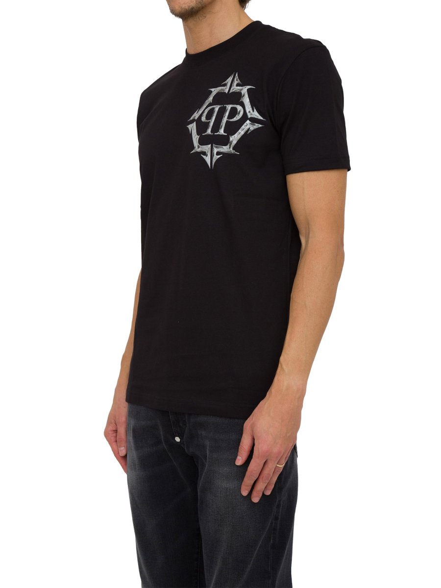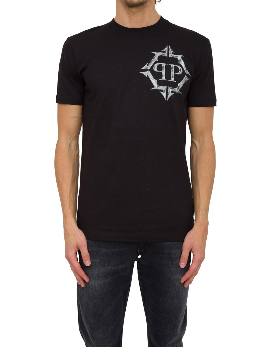 T-shirt girocollo da uomo Phillip Plein realizzata in cotone con maniche corte e logo a contrasto sul petto.