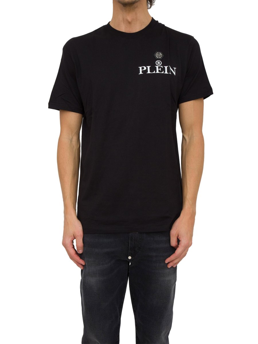 T-shirt da uomo Philipp Plein realizzata in jersey di cotone, lettering del brand stampato sul fronte, PP Hexagon su patch di pelle saffiano cucito sul punto cuore, girocollo smacchinato a costina e i bordi sono rifiniti a due aghi.