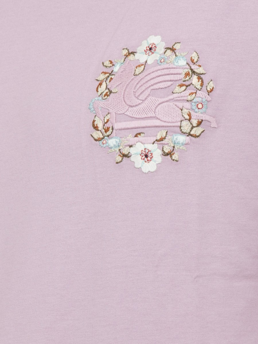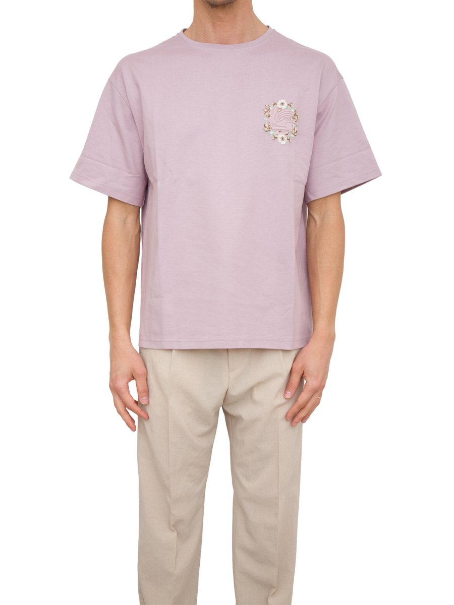 T-shirt da uomo Etro realizzata in jersey di cotone, girocollo a costine, maniche corte; Orlo dritto Ricamo logo Pegaso e motivo floreale sul petto.