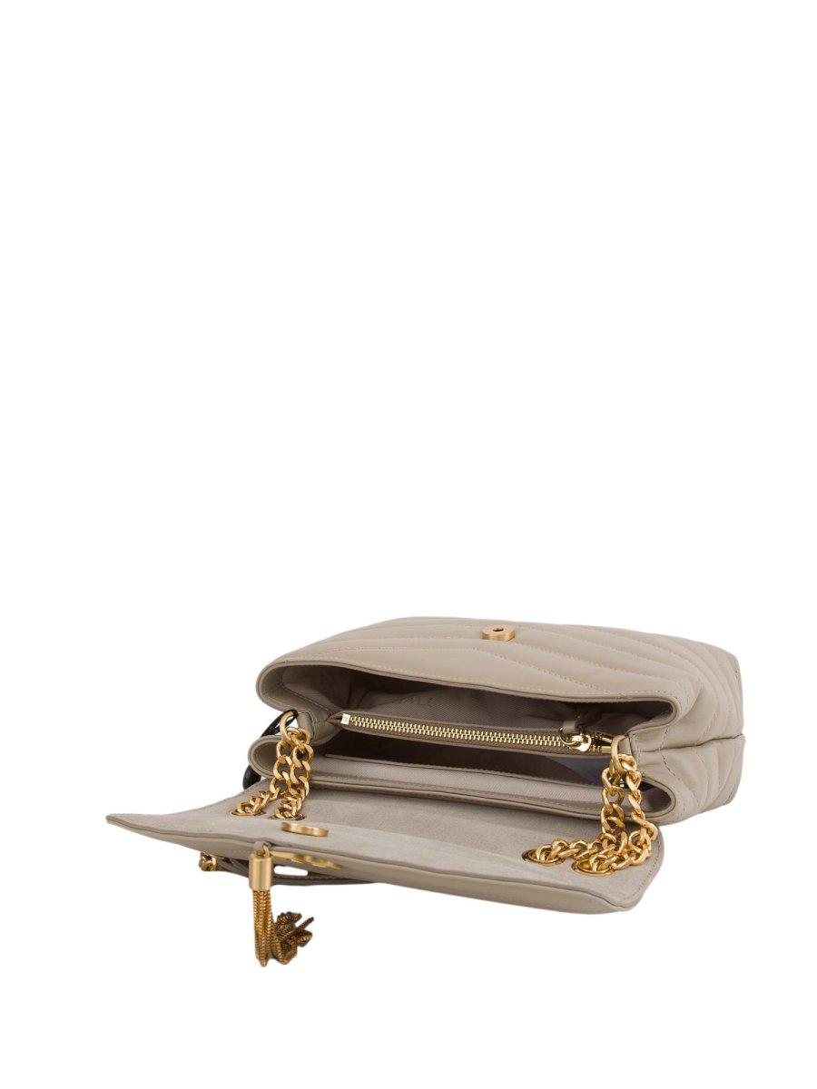 Borsa a tracolla ‘Dreamy’ in pelle di vitello pieno fiore italiano, lavorazione trapuntata, tracolla in catena. Twinset porta il suo messaggio di gentilezza e accoglienza in tutte le lingue del mondo: 'Dreamy' significa 'sognante' in inglese. Ampiezza 25 cm, altezza 18 cm, profondità 8,5 cm. Lunghezza tracolla scorrevole 25/50 cm.