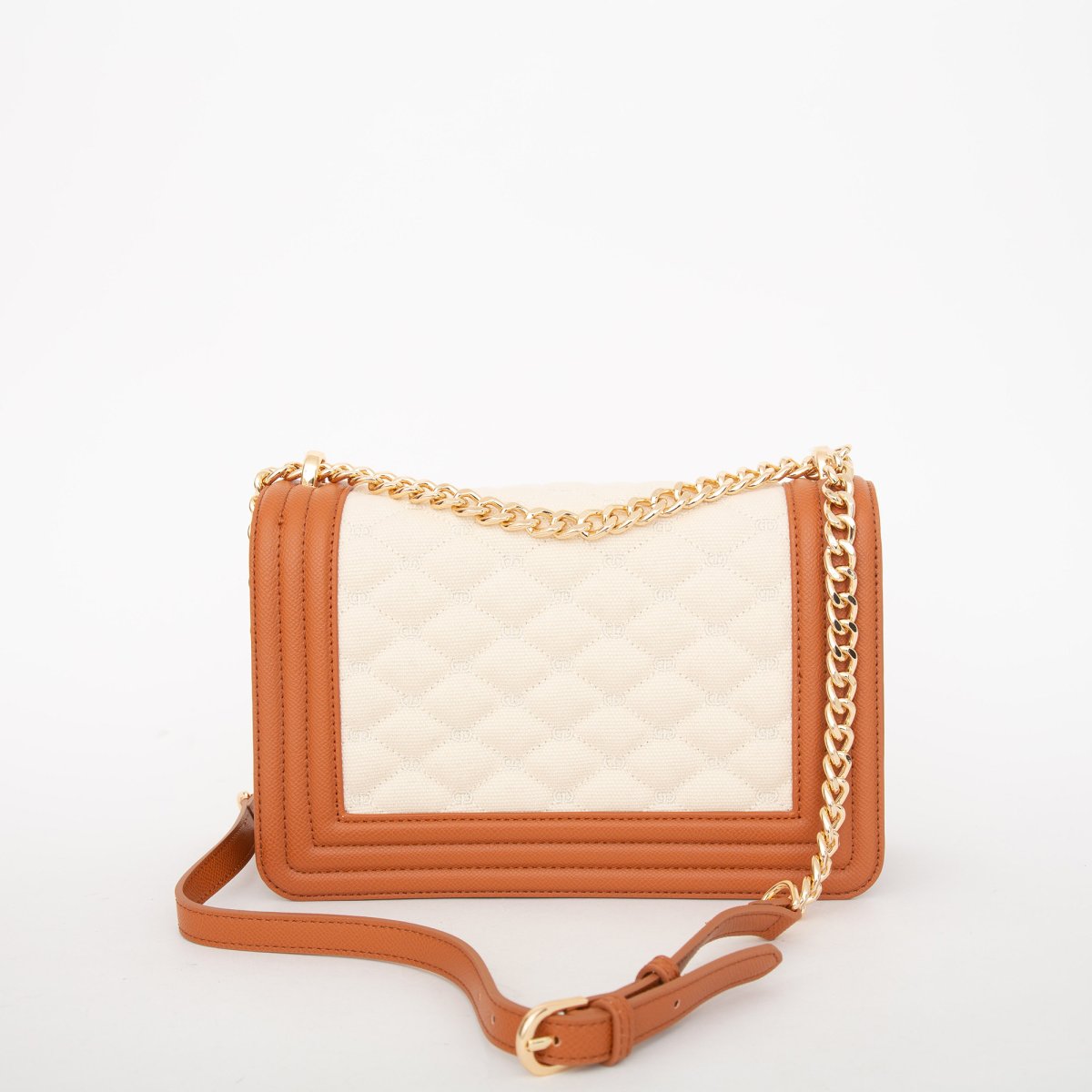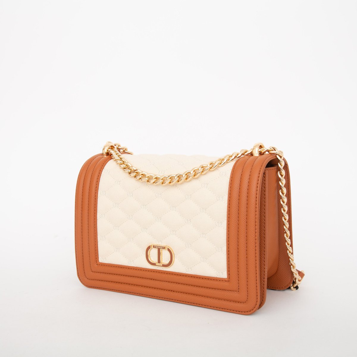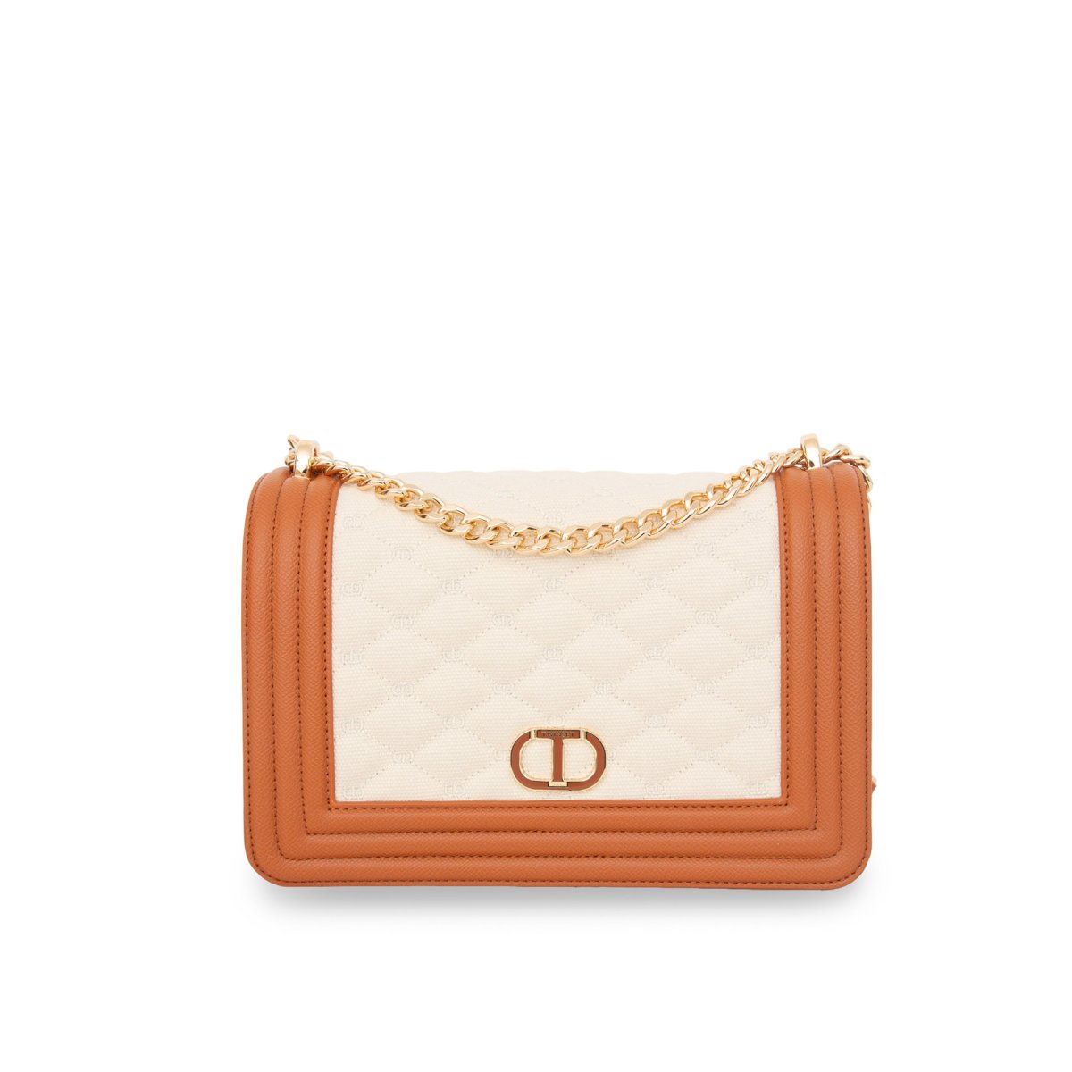 Borsa a tracolla firmata Twinset realizzata in eco-pelle con pannello in tessuto in lavorazione trapuntata con ricamo mini logo oval T all-over. Borsa dotata di tracolla scorrevole in catena con spallaccio.Collezione: Primavera Estate 23
