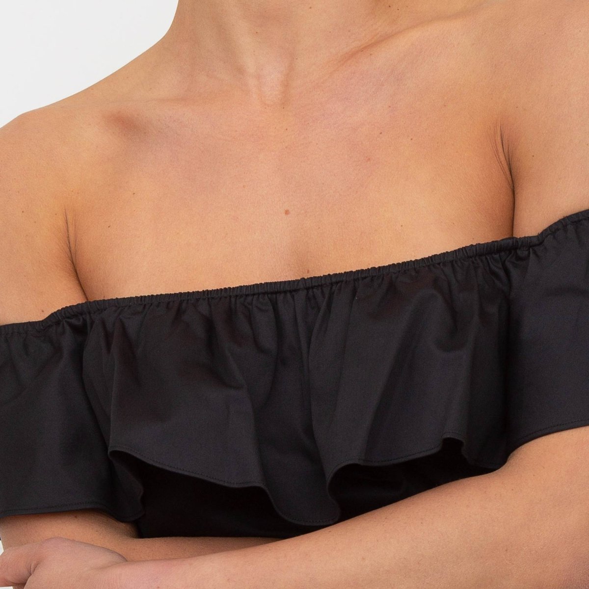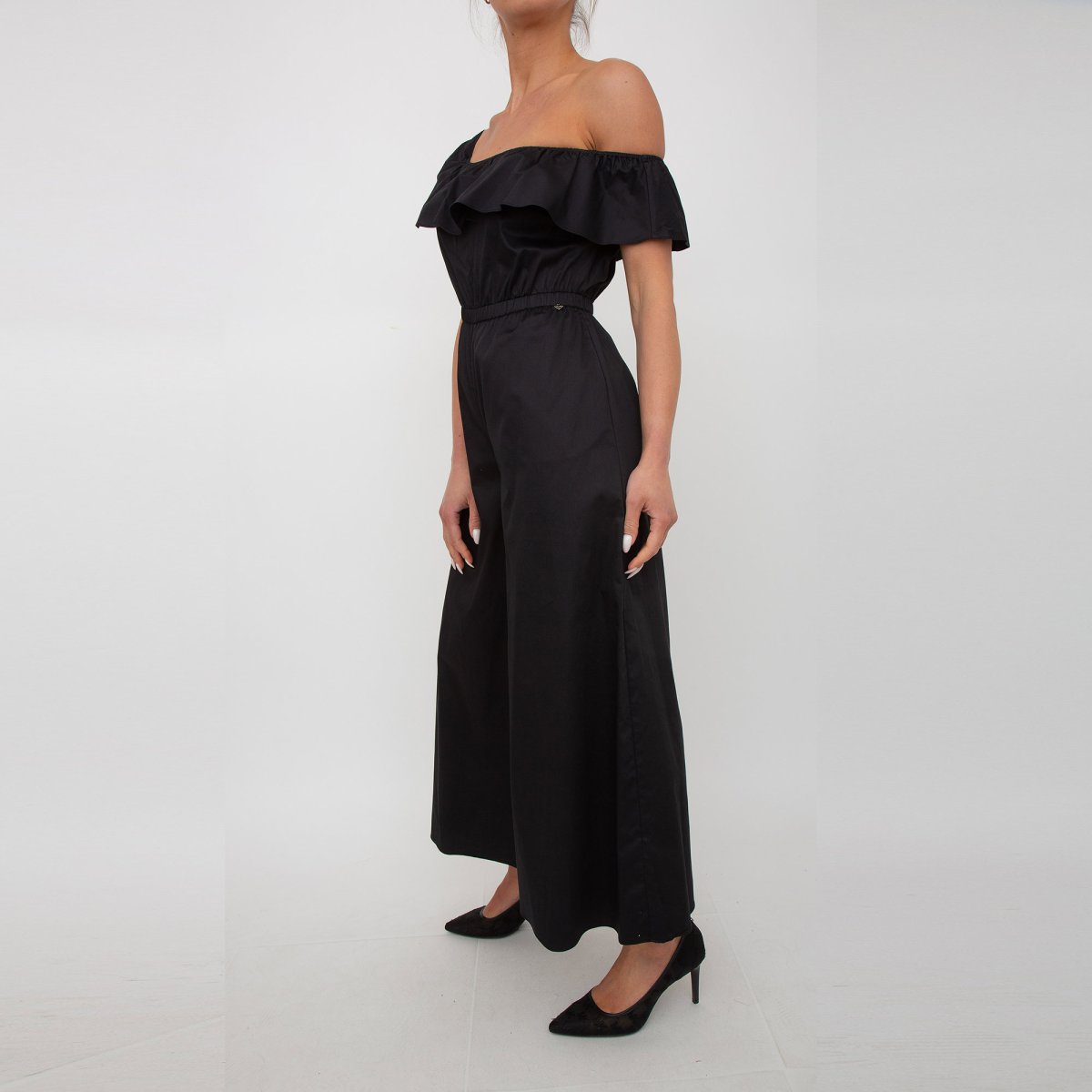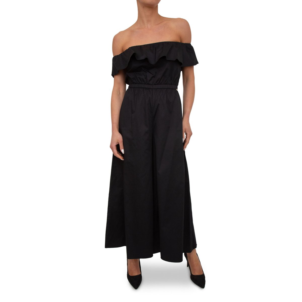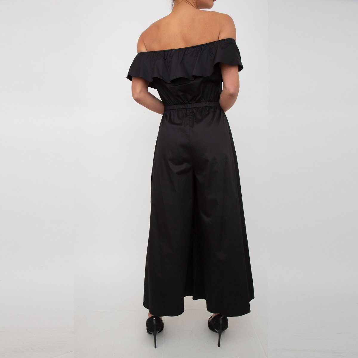 Tuta in tessuto 100% cotone con spalle scoperte e volant sul davanti. Il capo si adatta facilmente alla taglia grazie alla vita elasticizzata, e i pantaloni stile palazzo offrono una vestibilità ampia e comoda.