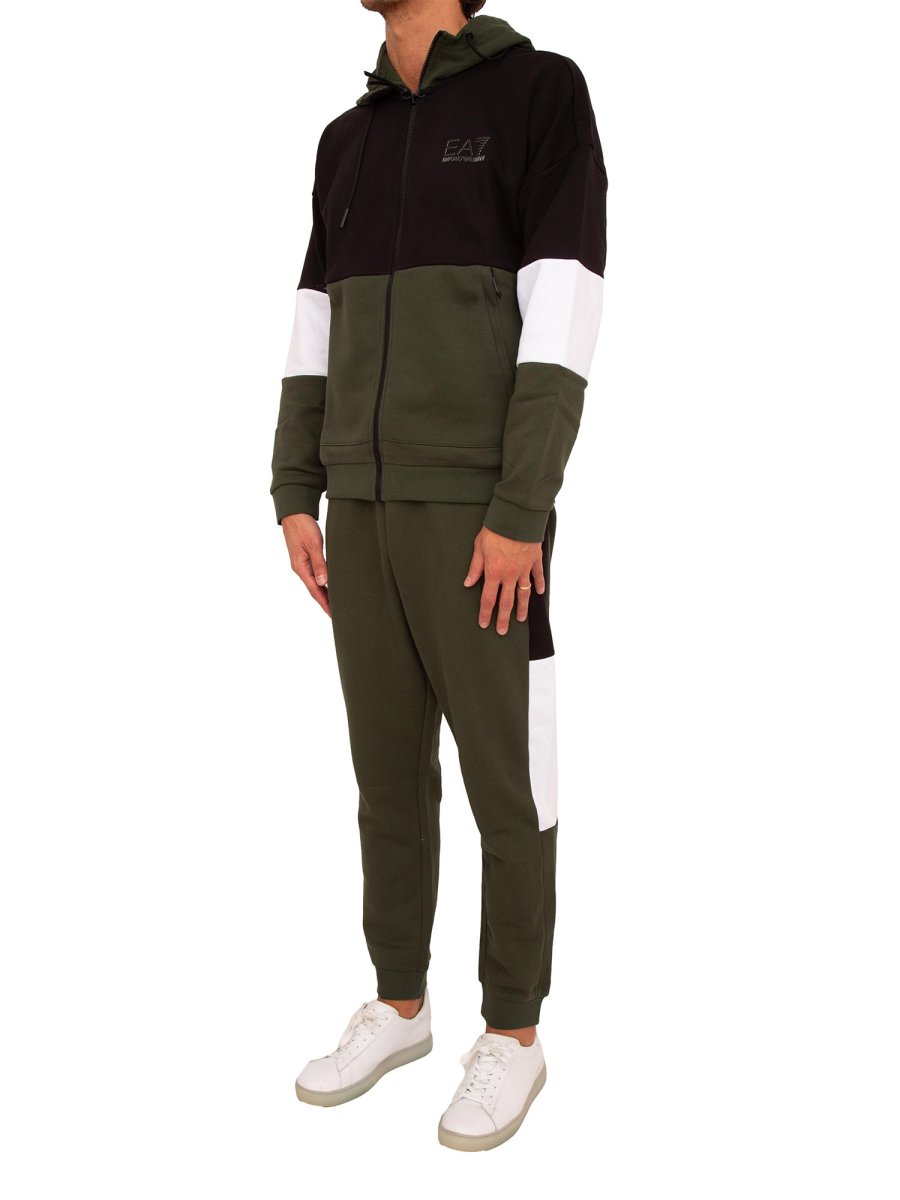 Tuta sportiva da uomo EA7 in misto cotone, composta da una felpa con cappuccio, due tasche a marsupio con zip e un pantalone jogger con coulisse.