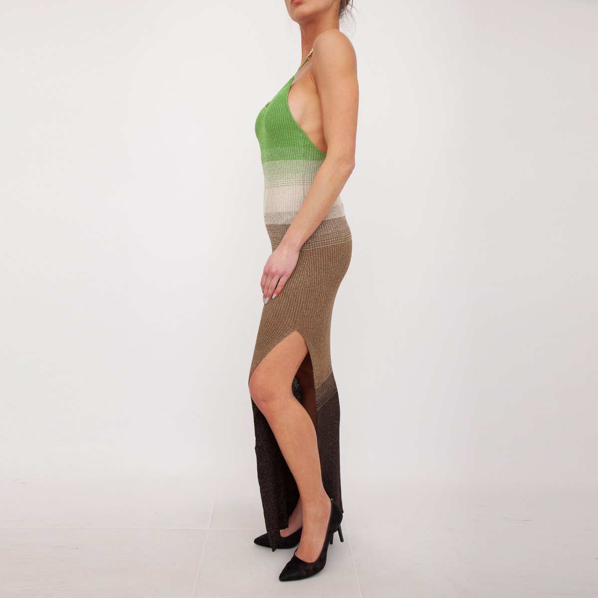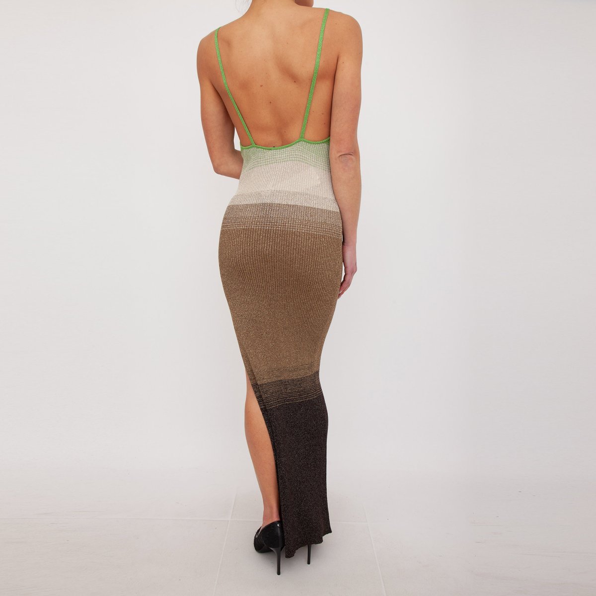 Abito lungo in lurex a quattro colori con effetto degradé, realizzato con lavorazione in costa. Bretelle con clip logo. Profondo spacco sulla sinistra. Dietro, ampio scollo.
