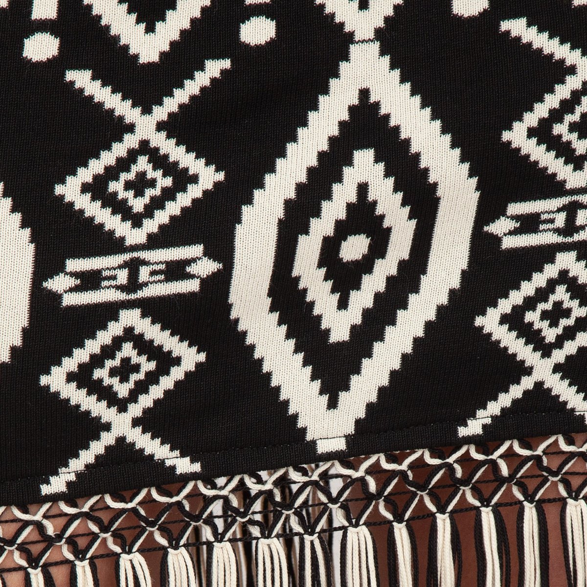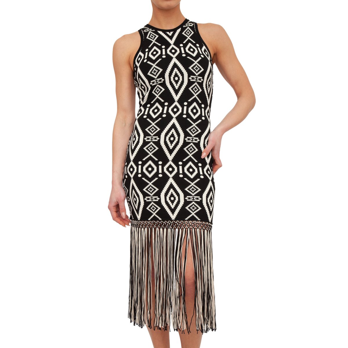 Abito midi in jacquard logato con scollo all’americana e lunghe frange bicolor al fondo che donano movimento alla figura. Zip invisibile al fianco.
