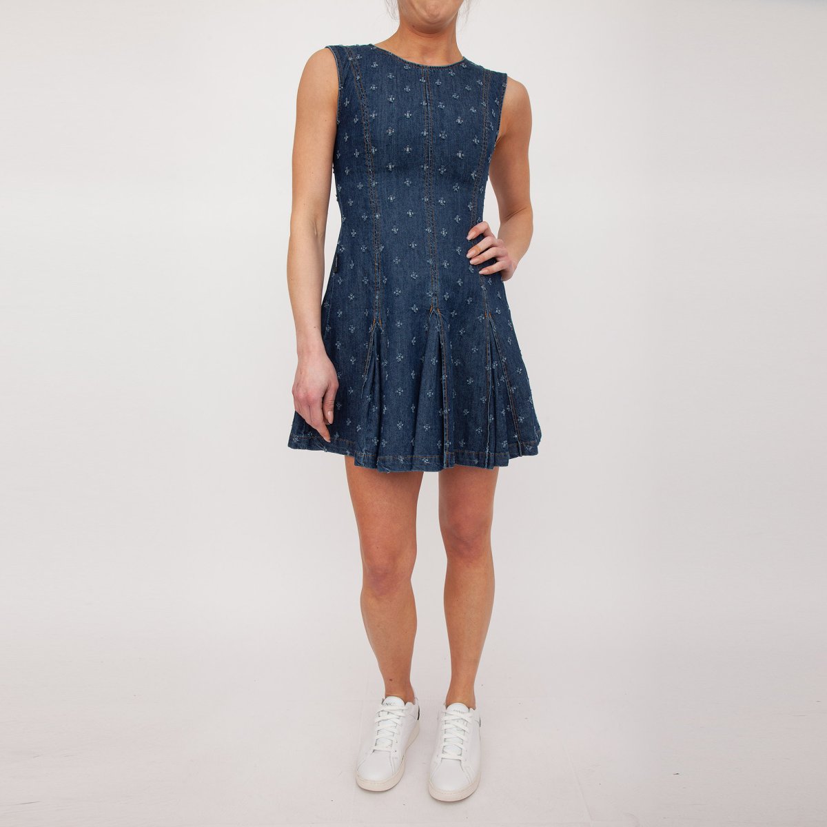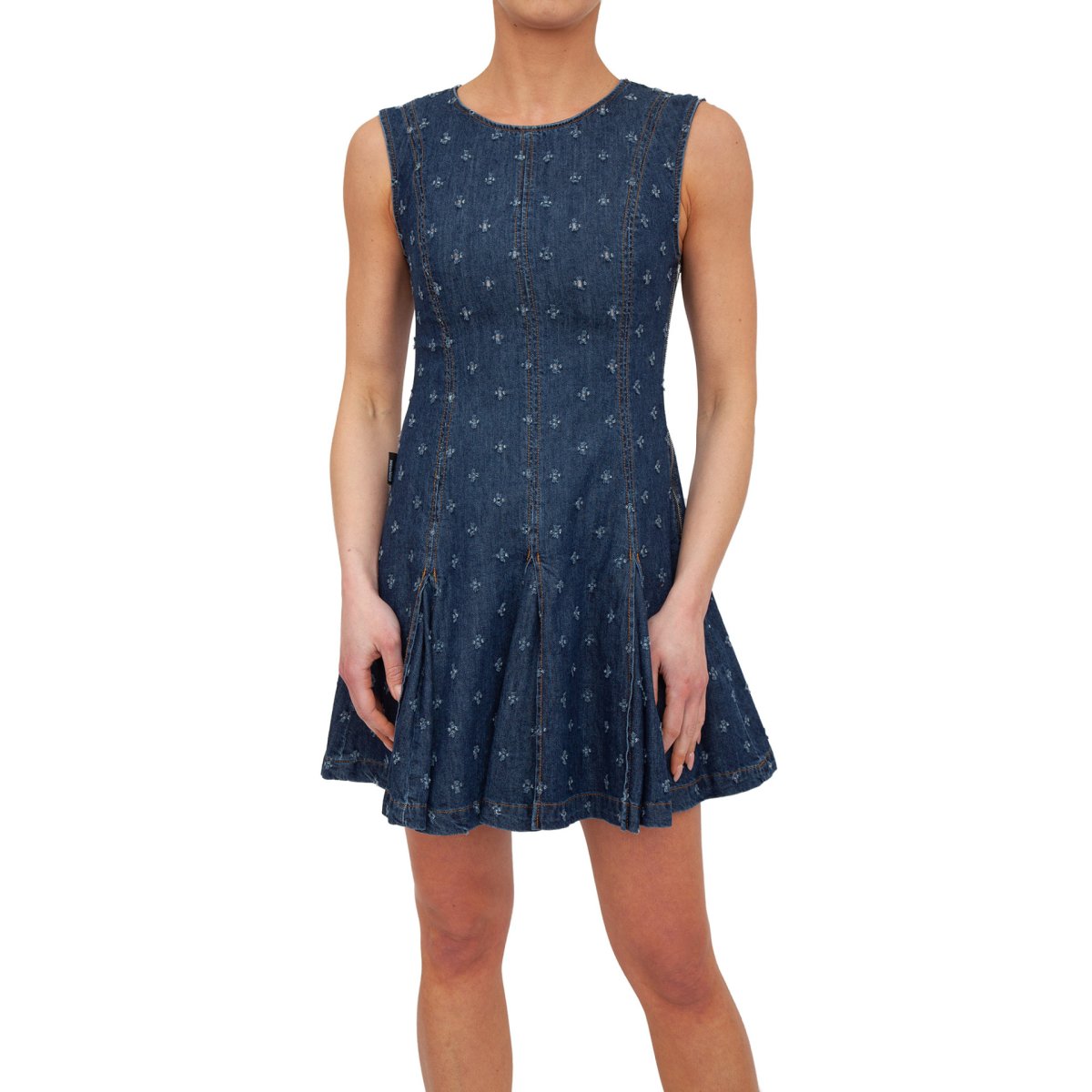 Abito in denim blu laserato, slim fit, gonna svasata con pieghe, slim in vita e chiusura laterale con zip.