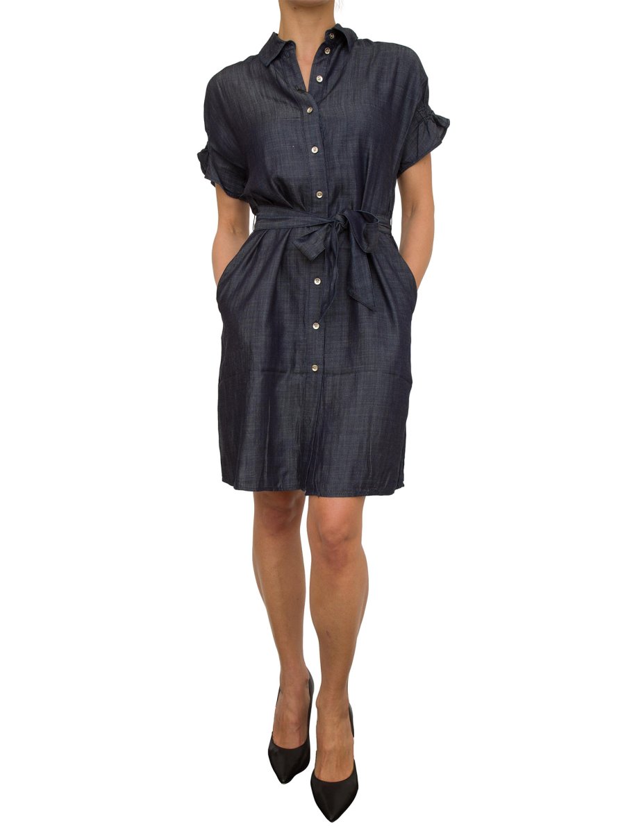 Questo abito dall'attitude romantica è realizzato in denim chambray di cotone: un tessuto casual che in questo caso diventa elegante e ricercato. Il mood del modello è sottolineato dalla costruzione a scamiciato con apertura con bottoni, maniche corte e cintura in vita.